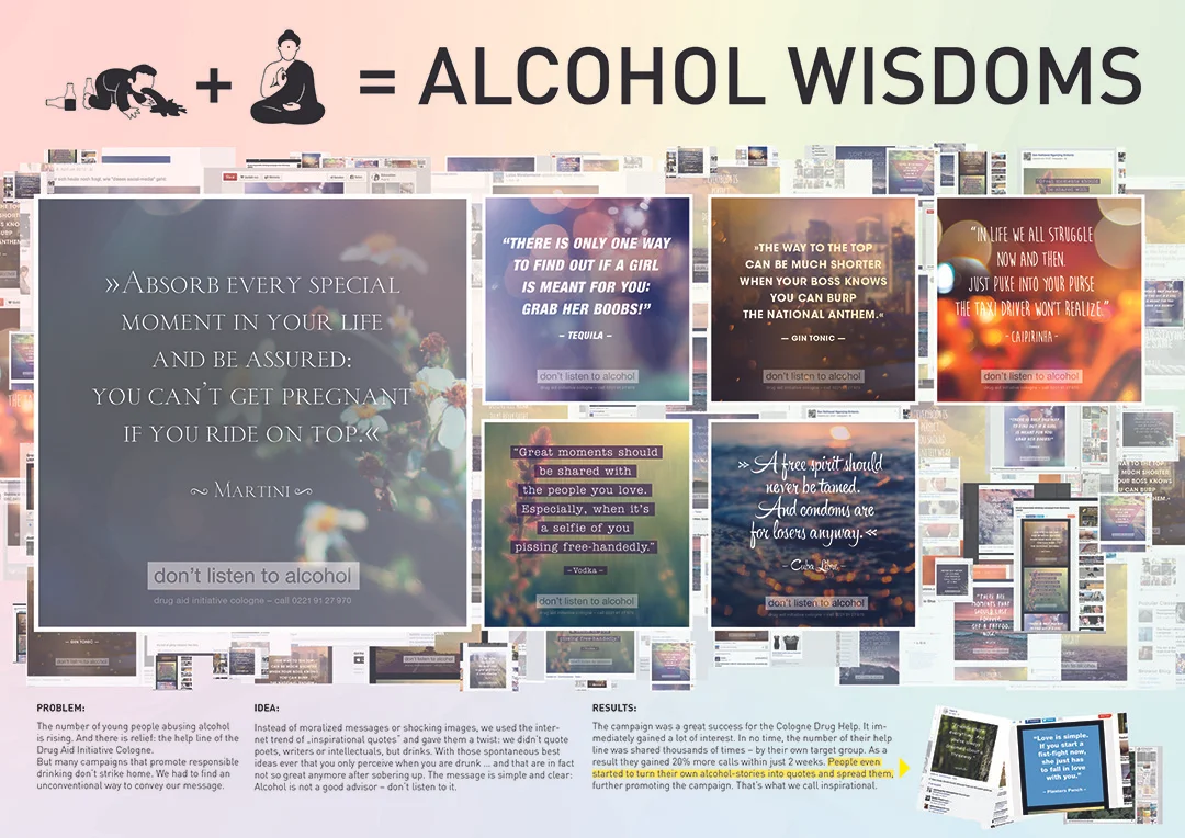 The Cologne Drug Help needed a campaign for responsible drinking targetting mainly teenagers. Our idea was to adress them not with moralized messages or shocking images but in a way they could relate to and would spread. And that is actually kinda fun. We used the internet trend of „inspirational quotes“ (hip blurry images with more or less wise quotes) and gave them a special twist: Instead of poets, writers or intellectuals we quoted drinks.